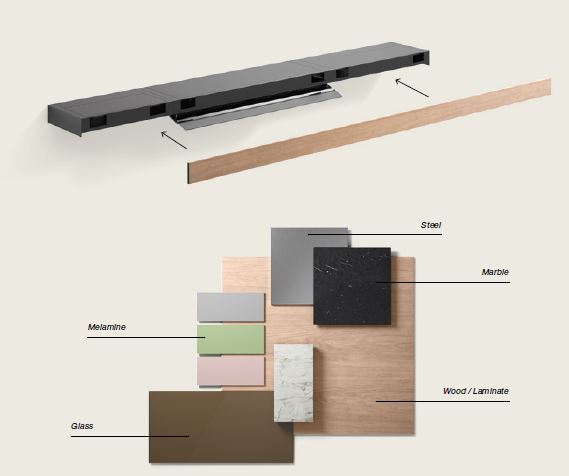 | Материал | Сталь, окрашенная в черный матовый цвет, алюминий, козырек закаленное стекло. передняя панель может быть выполнена по запросу - дерево, сталь, мрамор, меламин |